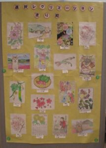 レクリエーションでも「塗り絵」を取り入れており、ご参加された方は掲示を行っています。どれも個性のある力作揃いです!